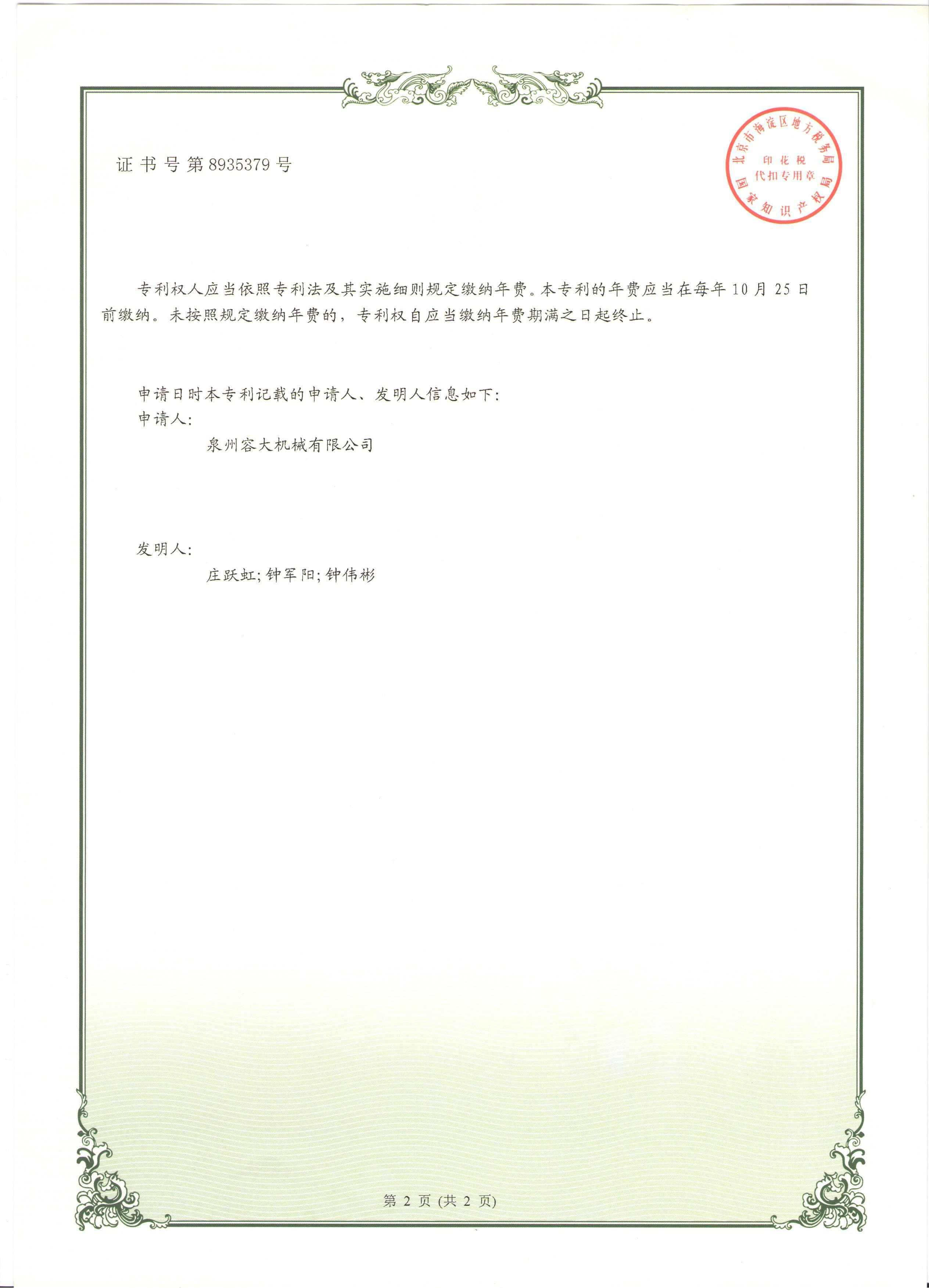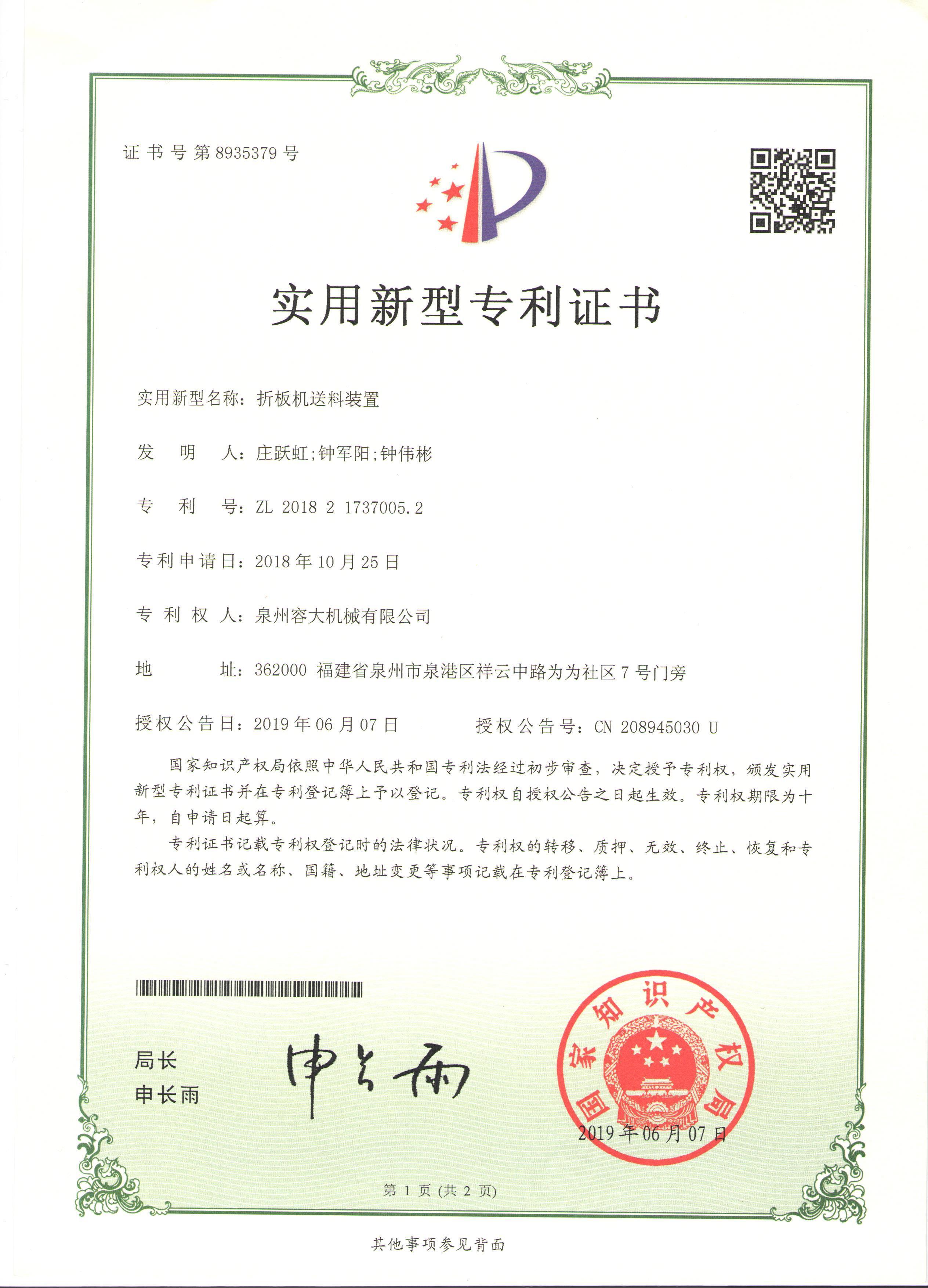 您的位置: 泉州容大機械有限公司 > 專利證書 > 剪板機送料裝置
